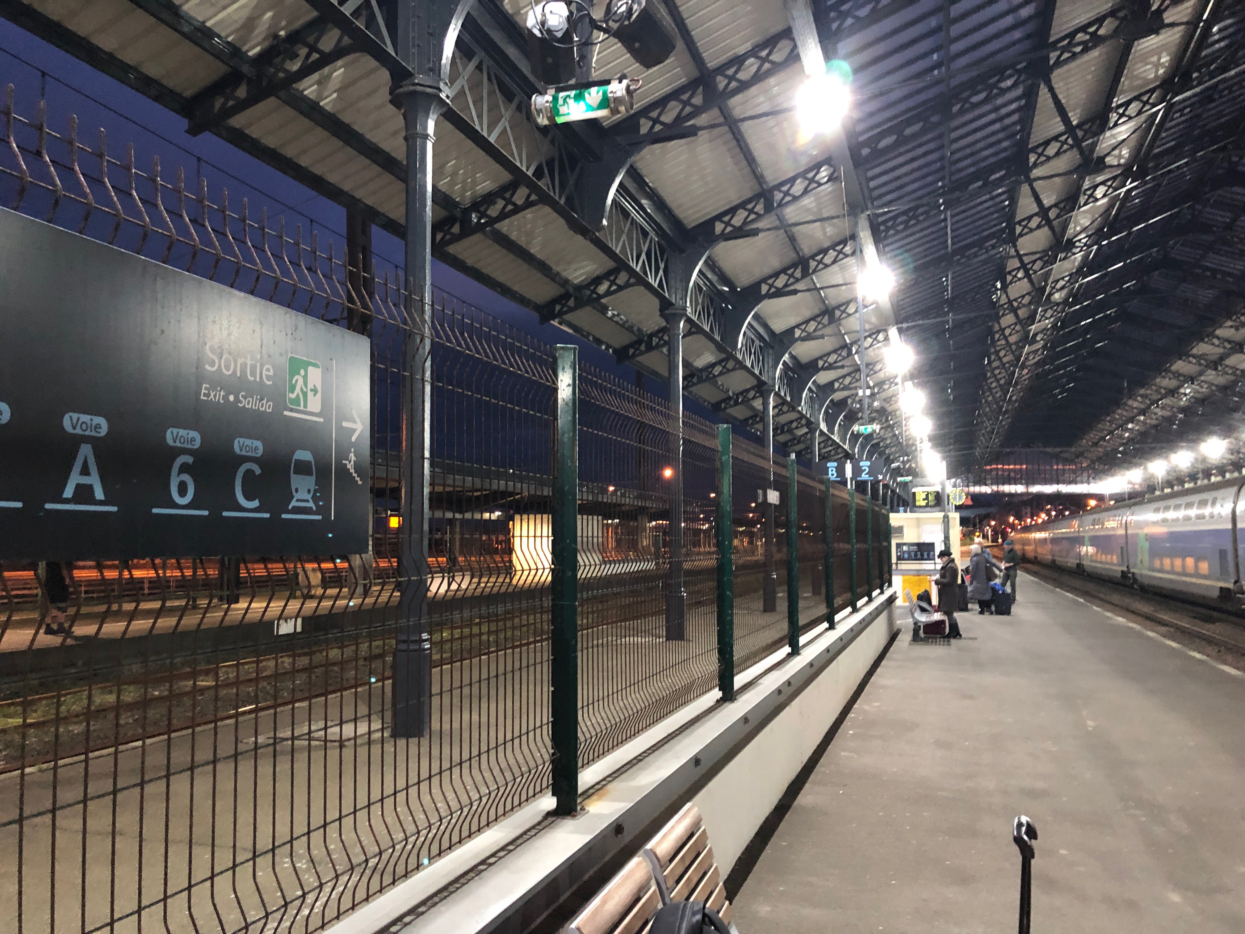 - Hinter diesem Gitter im Bahnhof Hendaye sind die Gleise in Iberischer Breitspur und dort fährt der Nachtzug nach Spainen und Portugal